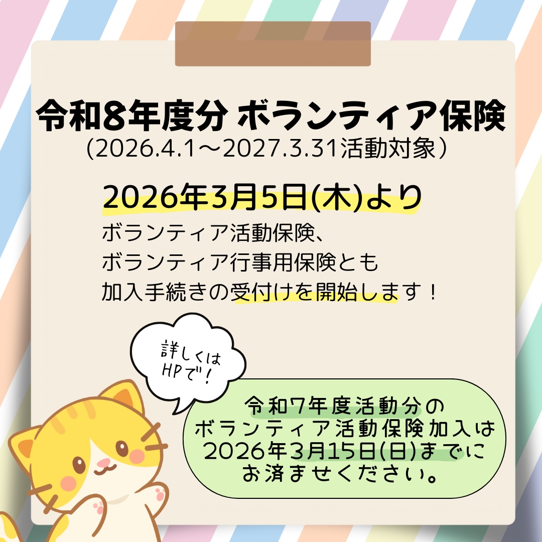 令和8年度(2026年4月1日~2027年3月31日)におけるボランティア活動を対象とする、「ボランティア保険」の受付け開始日のご案内を掲載しました。